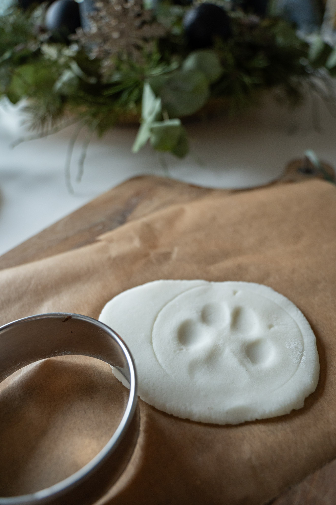 Bevor du die Pfote aufdrückst, drücke mit dem Ausstecher leicht die Fläche vor, auf der der Abdruck entstehen soll. So weißt du genau, wo die Pfote mittig platziert wird, und vermeidest schiefe Abdrücke.