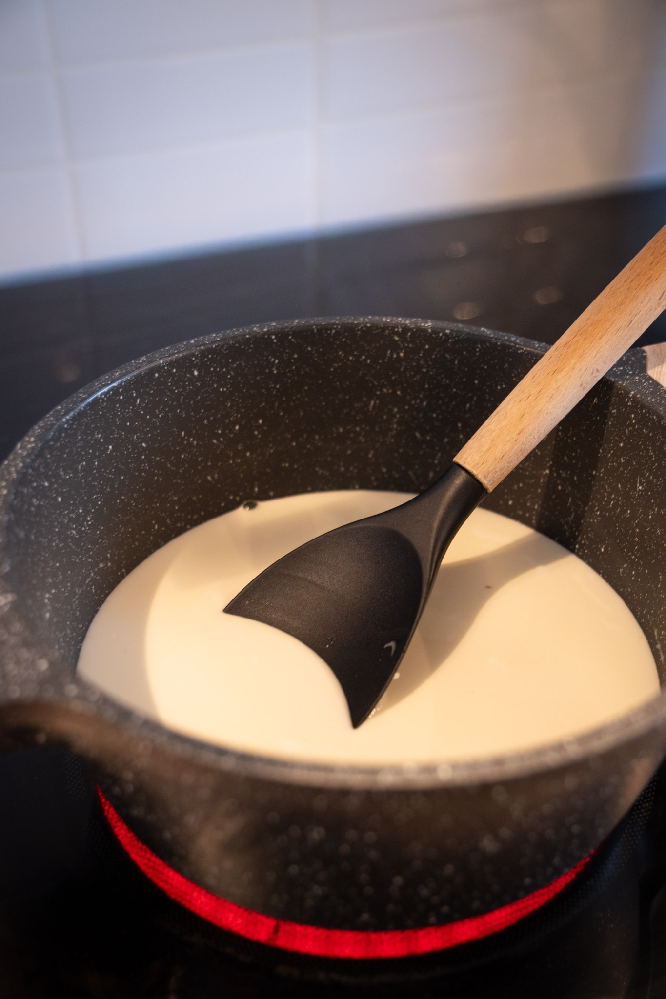 - 2. Bei mittlerer Hitze erwärmen: Jetzt unter ständigem Rühren erhitzen. Nach wenigen Minuten wird die Masse zäh und beginnt, sich zu einem „Kloß“ zusammenzuziehen.