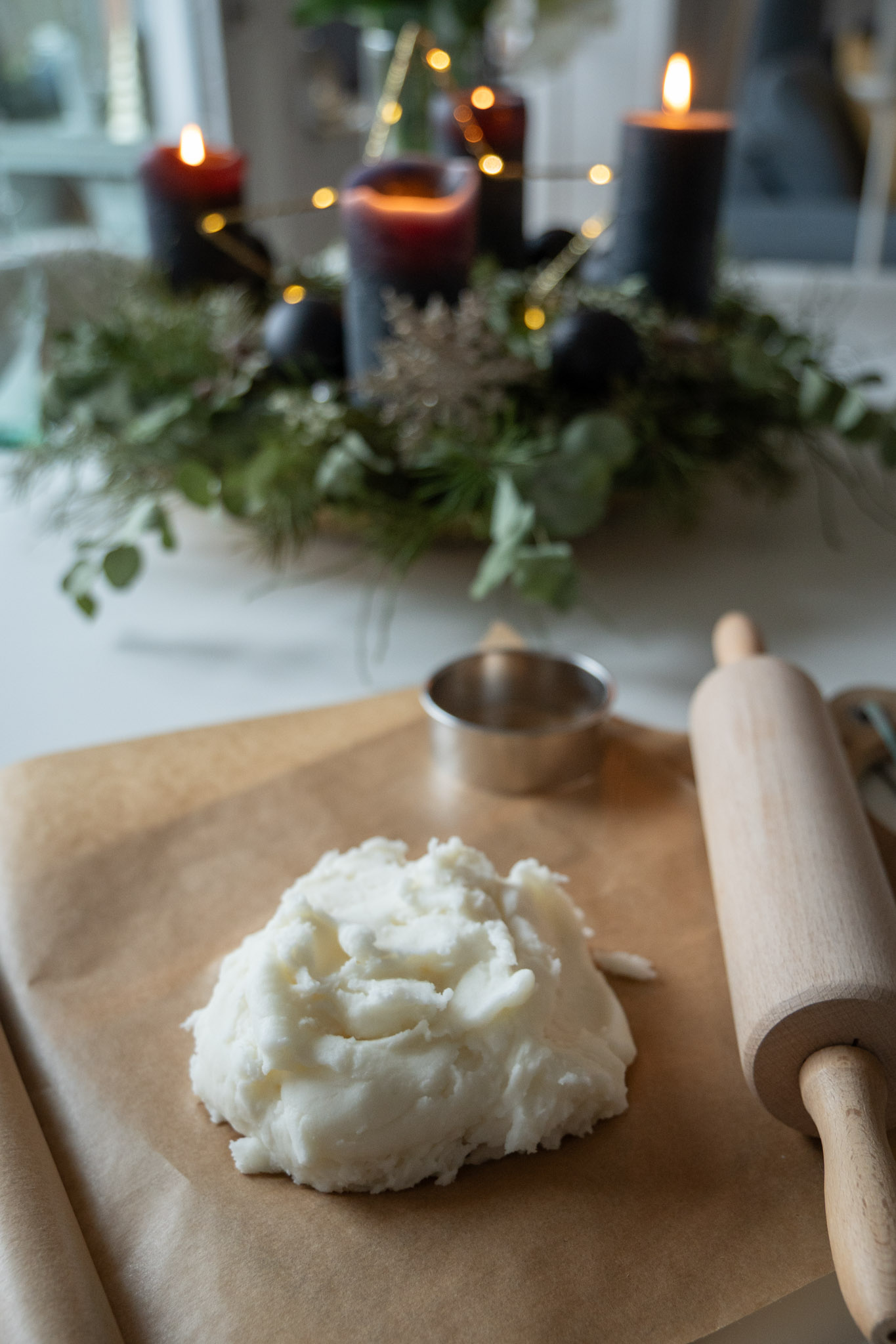 - Rolle den Teig auf Backpapier aus (ca. 0,5–1 cm dick).
