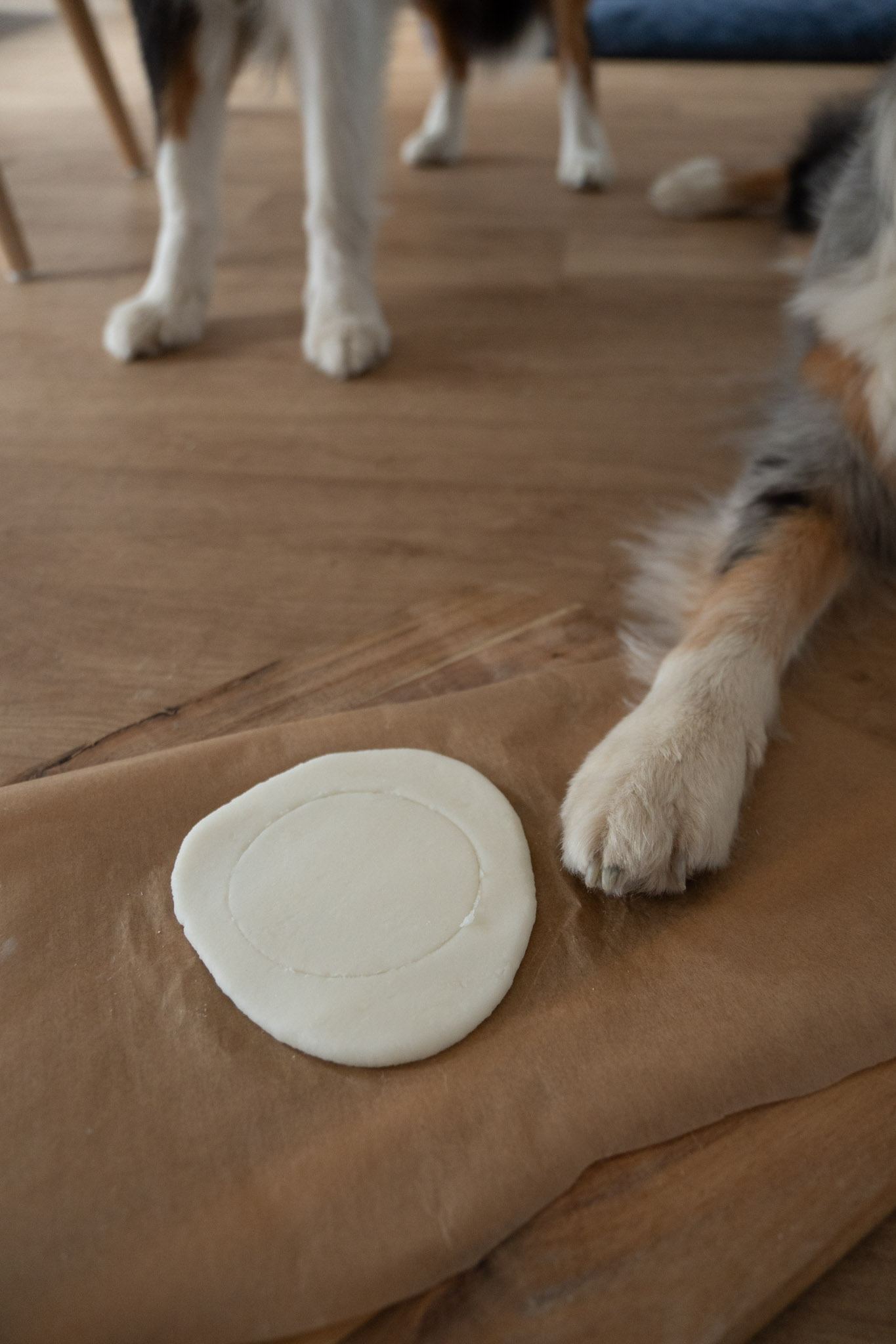 Drücke die Pfote sanft, aber bestimmt in den Teig. Lieber einmal bewusst als mehrfach korrigieren. Kleine Unregelmäßigkeiten machen den Abdruck übrigens erst richtig charmant.